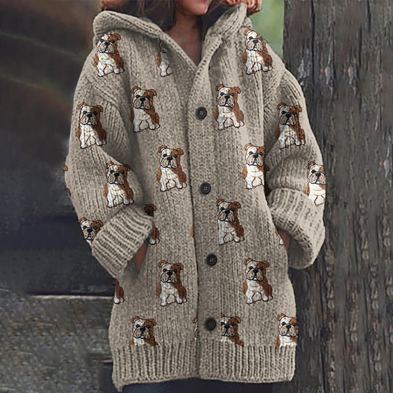 Cute English Bulldog Applique Embroidery Art Cozy Hooded Cardigan Sweater
