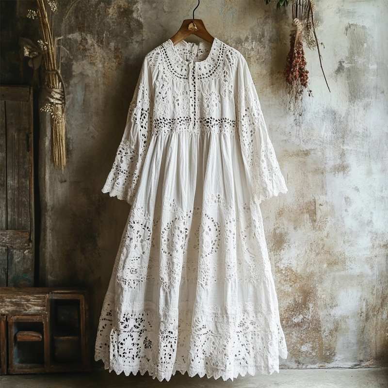 Vintage Floral Embroidered Lace Hem Linen Flowy Maxi Dress