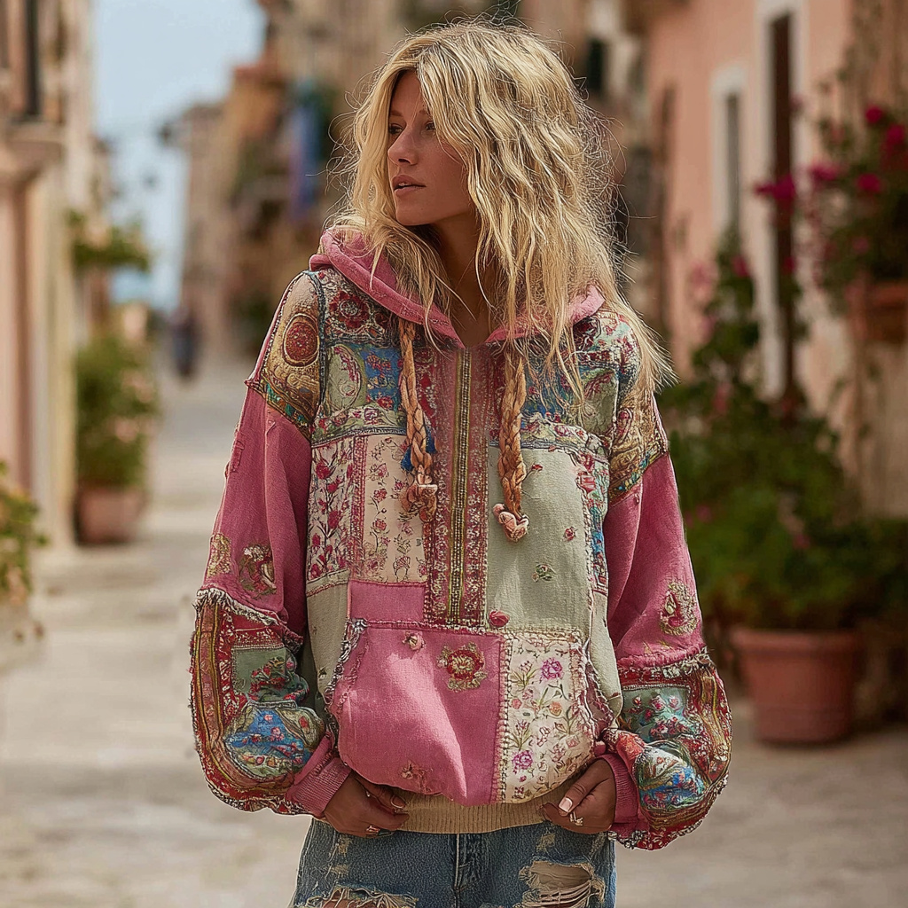 Women's Bohemian Floral And Ethnic Pattern Patchwork Cozy Warm Hoodie