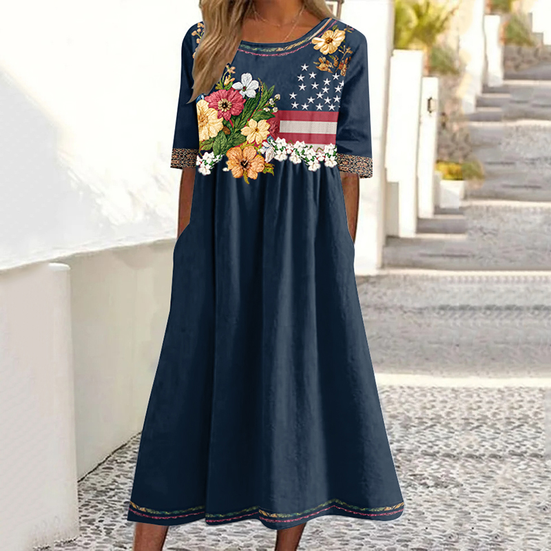 Women's Independence Day Flag Flower Art Short Sleeves Midi Dress
