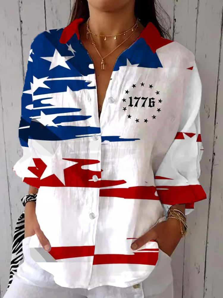 Women's Independence Day Vintage Flag Design Printed Casual Shirt