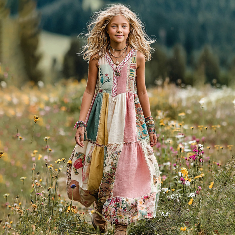 Young Girl's Floral Patch Print Linen Tank Dress